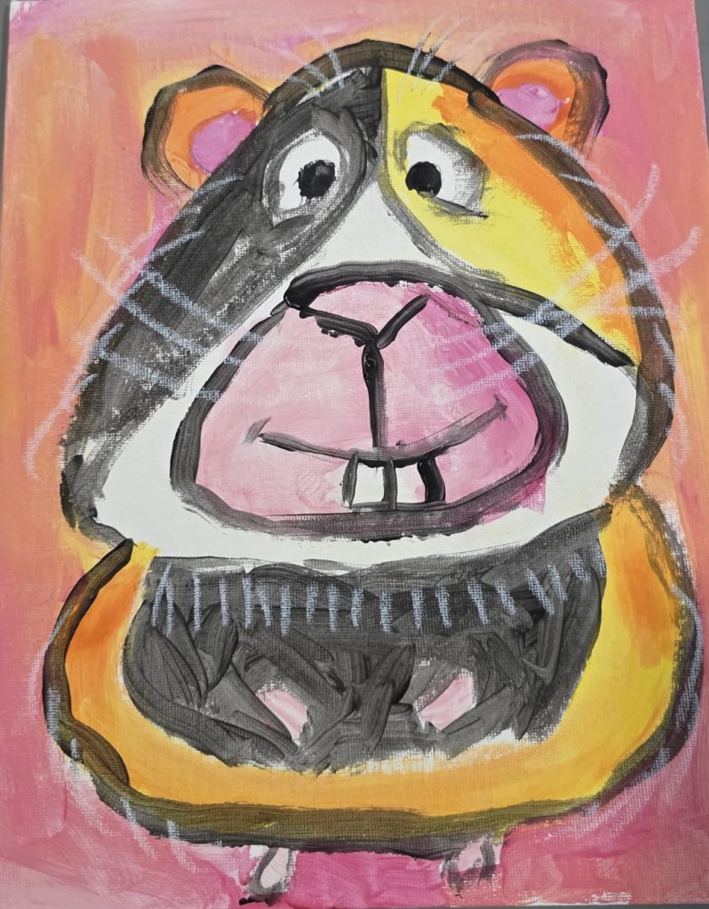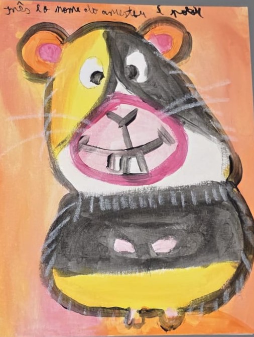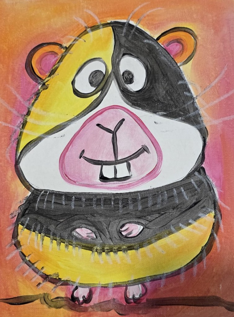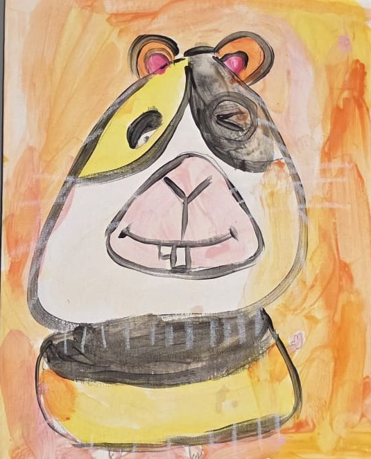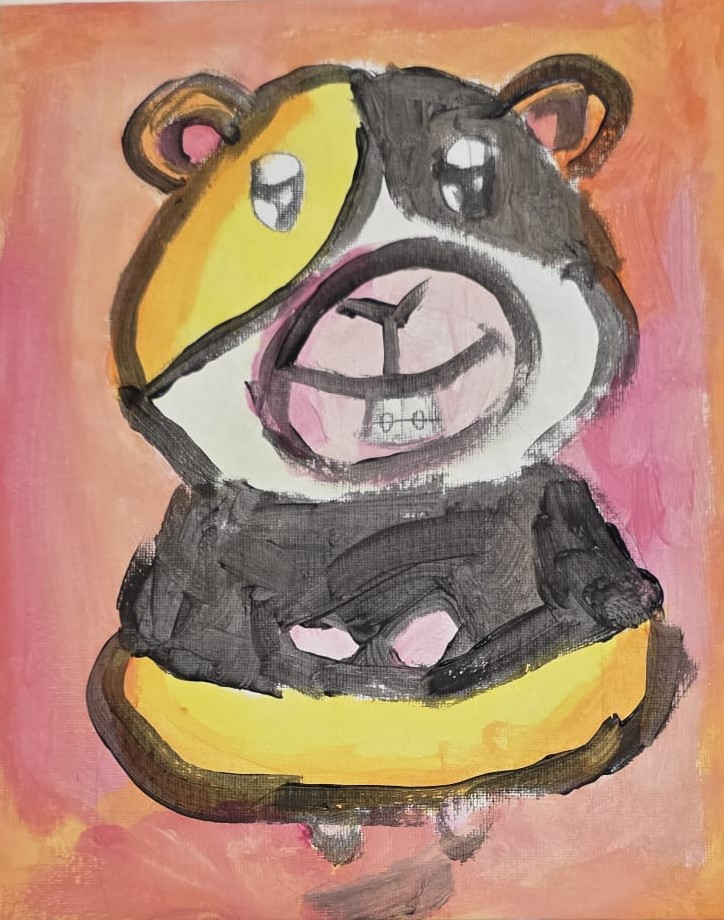 O resultado é uma composição alegre e lúdica, que evidencia as potencialidades do guache — uma técnica versátil que permite tanto efeitos opacos e densos quanto transparências delicadas, expressando com sensibilidade a personalidade divertida do personagem retratado.