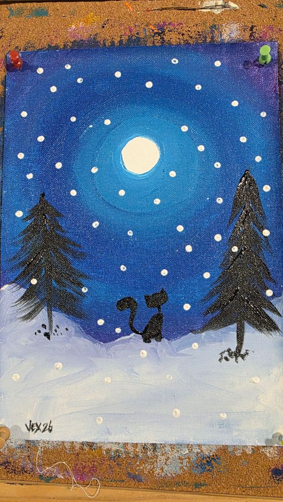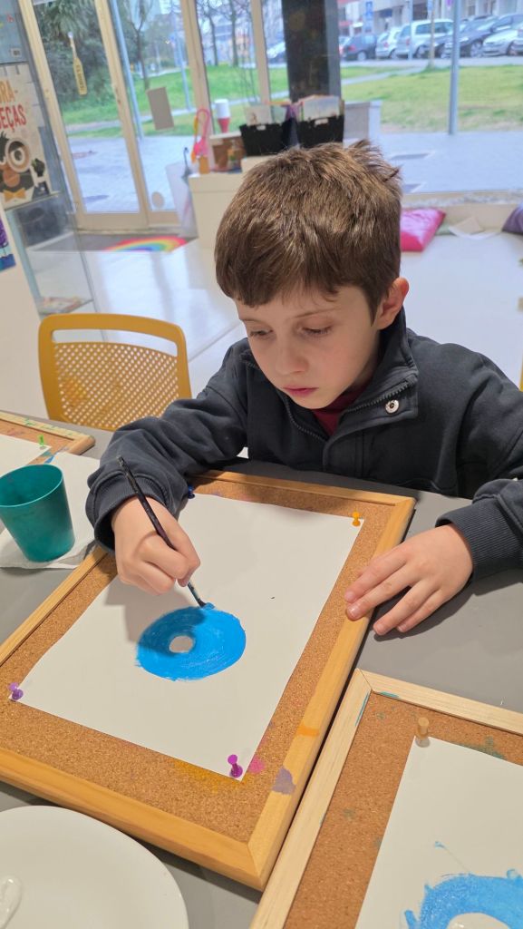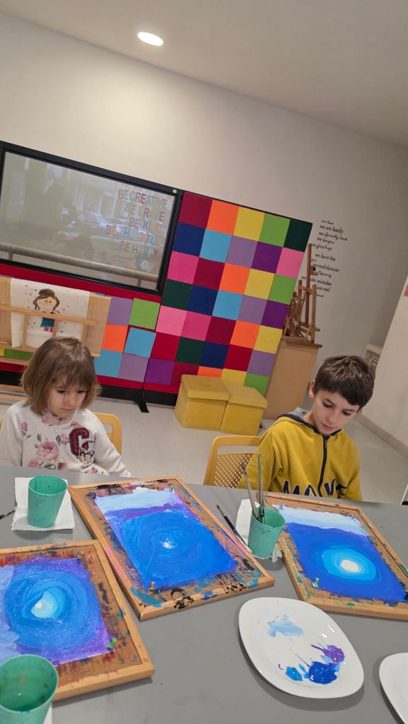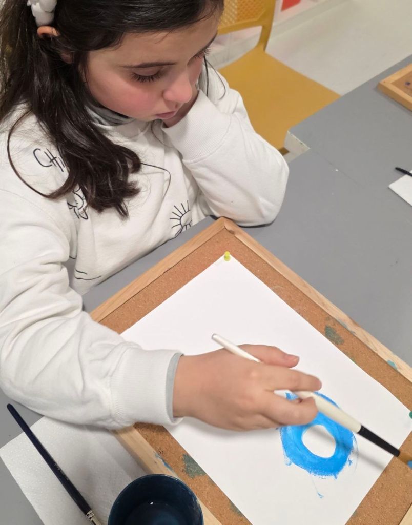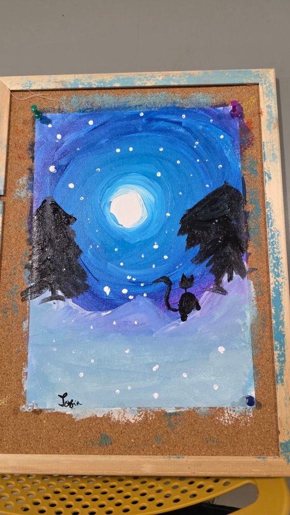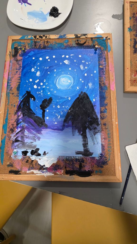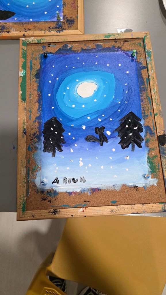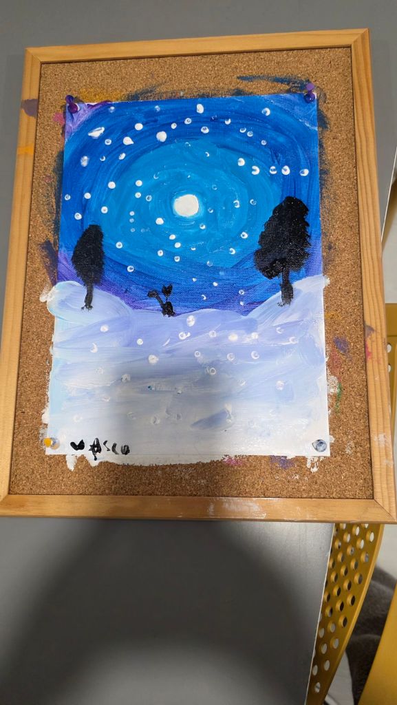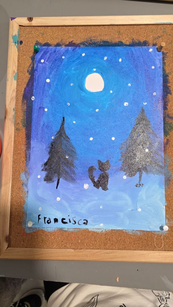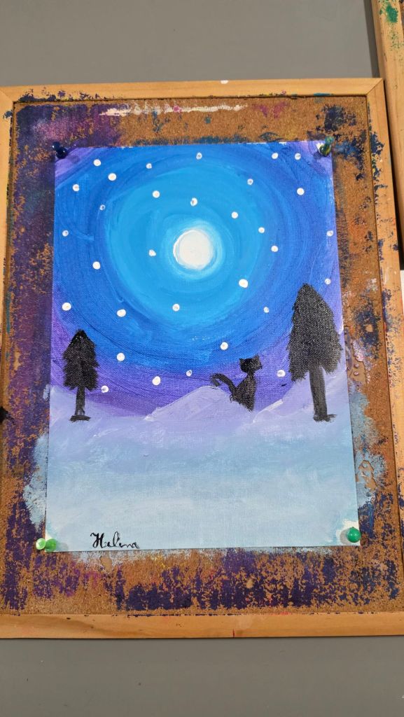 Nesta atividade, cada artista realiza uma pequena pintura de paisagem de inverno diretamente com pincel, sem desenho ou esboço prévio, explorando mistura de azuis, luz da lua, neve e silhuetas simples (árvores e animal). O objetivo é desenvolver confiança no gesto, criatividade e autonomia, num ambiente descontraído e seguro.